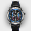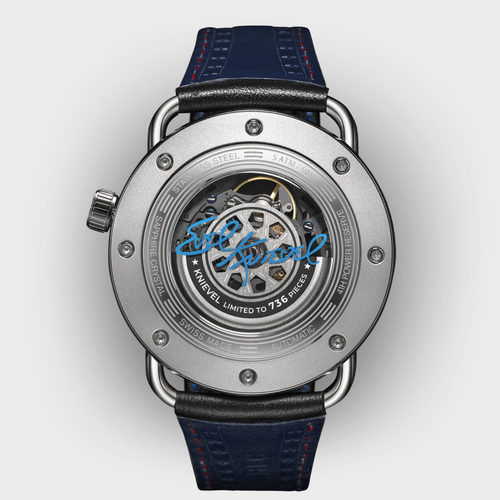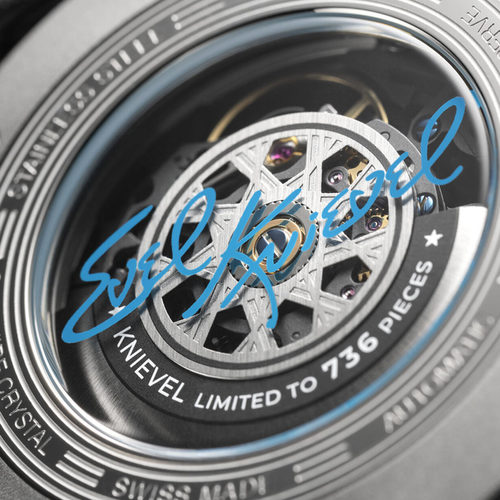 * K&K Promotions 原廠認證授權生產 * TTT Knievel 全球限量版,其設計靈感源自 Evel Knievel 標誌性的「鯊魚跳躍」(Shark Jump) : Harley-Davidson XR750 —— 這是他職業生涯中的最後一輛特技摩托車。 為他傳奇的職業生涯畫上了句號,但也更加凸顯了他的傳奇色彩。 每一款 TTT Knievel 腕錶12 點鐘位置的星星, 均採用 XR750 原廠離合器桿的鋁材打造而成, 捕捉了 Evel 最後一次飛躍的精神 —— 大膽、魯莽、令人難忘。 ll 全球限量 736 只 ll